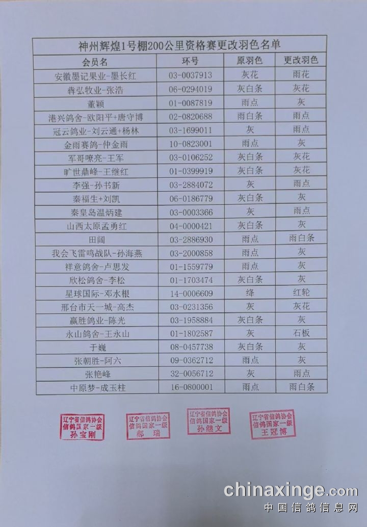 神州辉煌1号棚200公里资格赛更改羽色名单