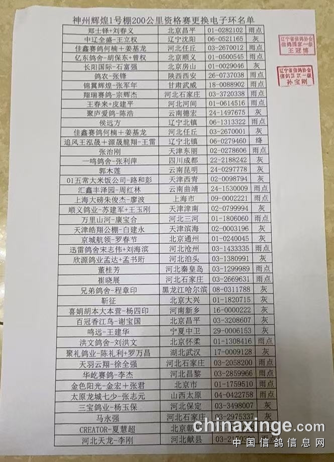 神州辉煌1号棚200公里资格赛更改羽色名单
