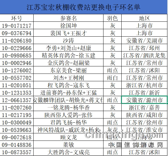 江苏宝宏秋棚收费站丧失飞行能力鸽名单
