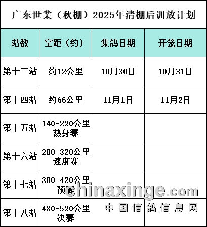 广东世業(秋棚)第十四站66公里训放定于2025年11月1日晚集鸽,11月2日早上开笼!如遇恶劣天气,则改期另行通知!