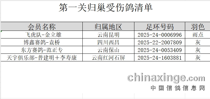 2025年天南铜都(大秋棚)第一关归巢受伤鸽清单