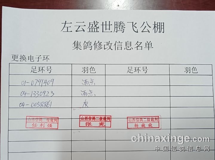 左云盛世腾飞公棚2025年加站赛集鸽修改信息名单