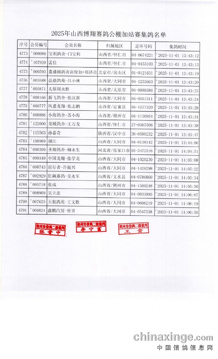 山西博翔赛鸽公棚加站赛集鸽名单(按时间)