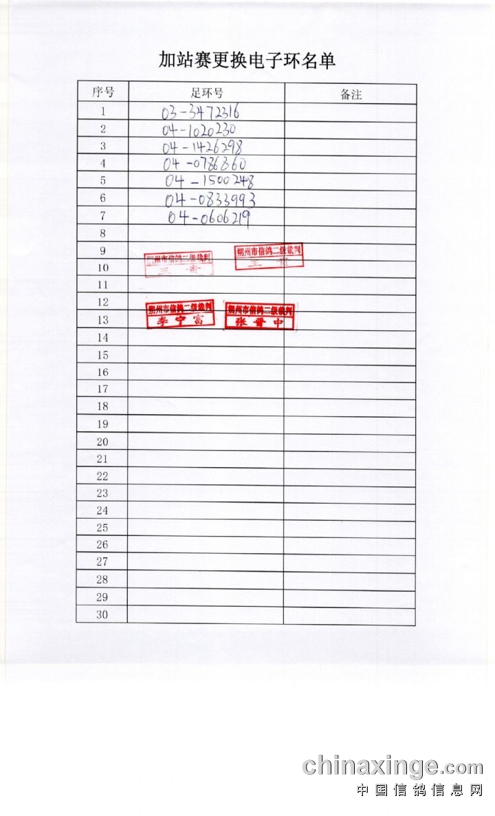 加站赛更换电子环及集鸽名单执行裁判签字确认