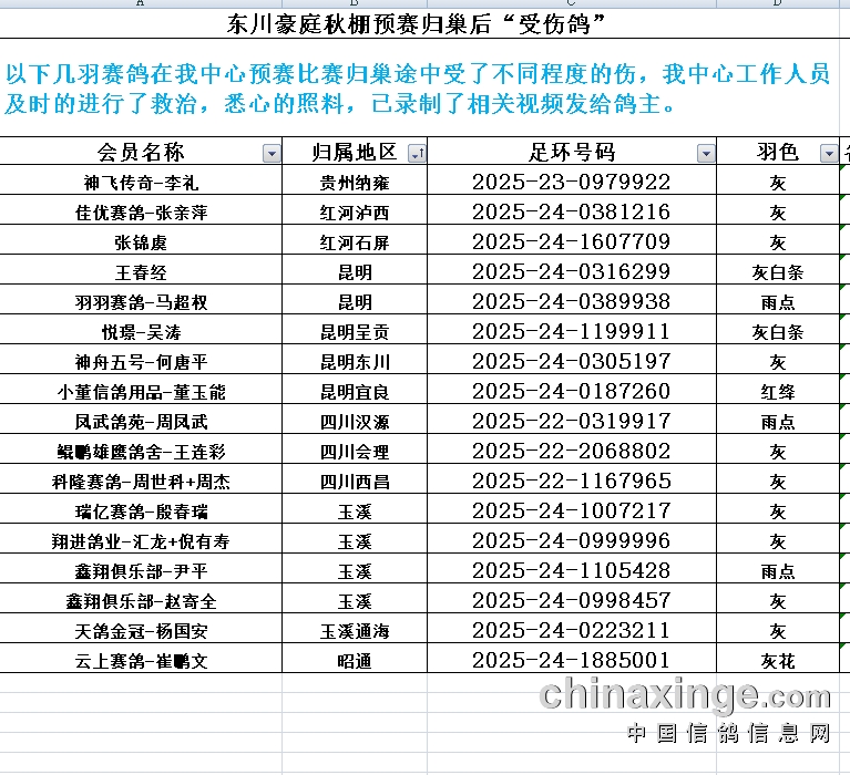 东川豪庭秋棚预赛上笼后“羽色更改”和“重配电子环”名单