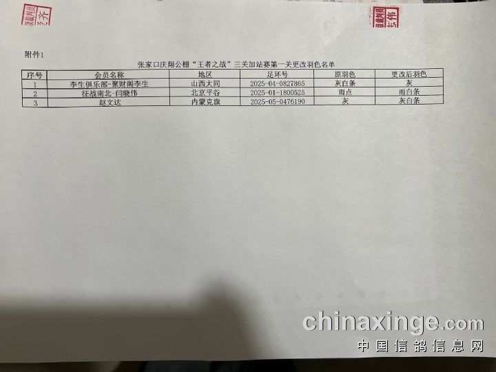 张家口庆翔公棚加站赛第一关更改羽色名单