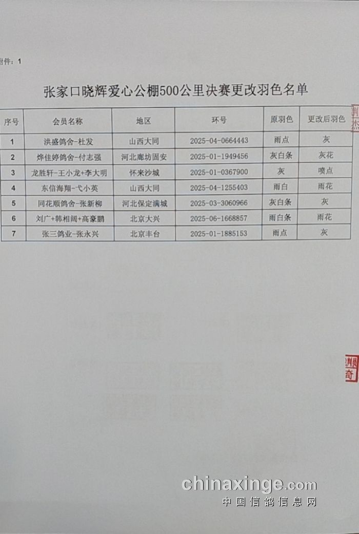 张家口晓辉爱心公棚500公里决赛集鸽证明及照片