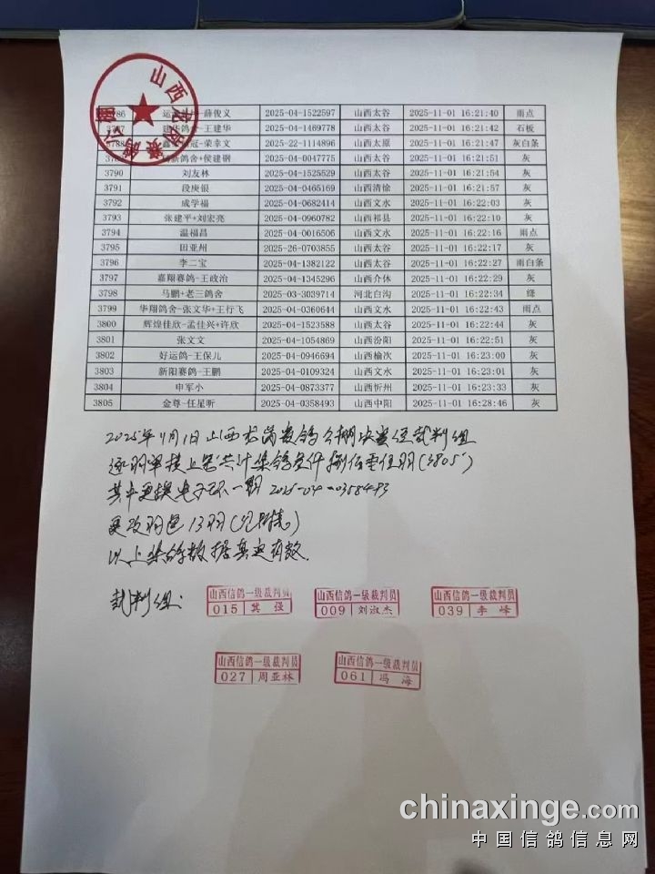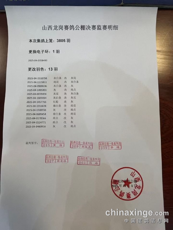 山西龙岗赛鸽公棚决赛上笼集鸽清单