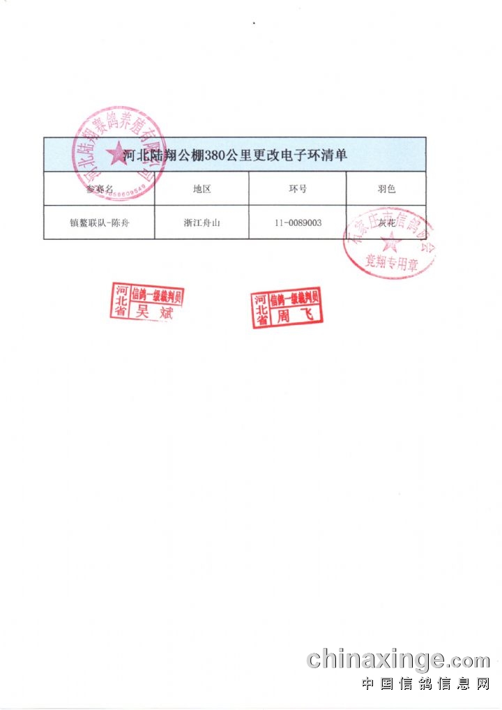 河北陆翔公棚:380公里预赛集鸽清单