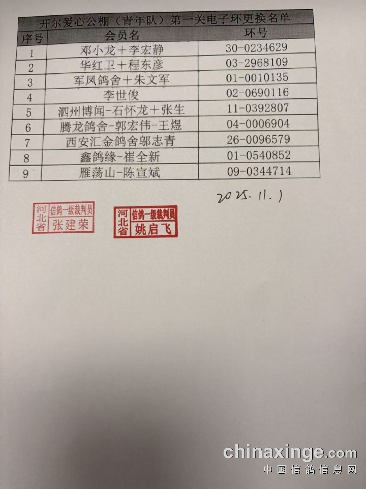 开尔爱心公棚(青年队)第一关当日归巢清单(按会员)