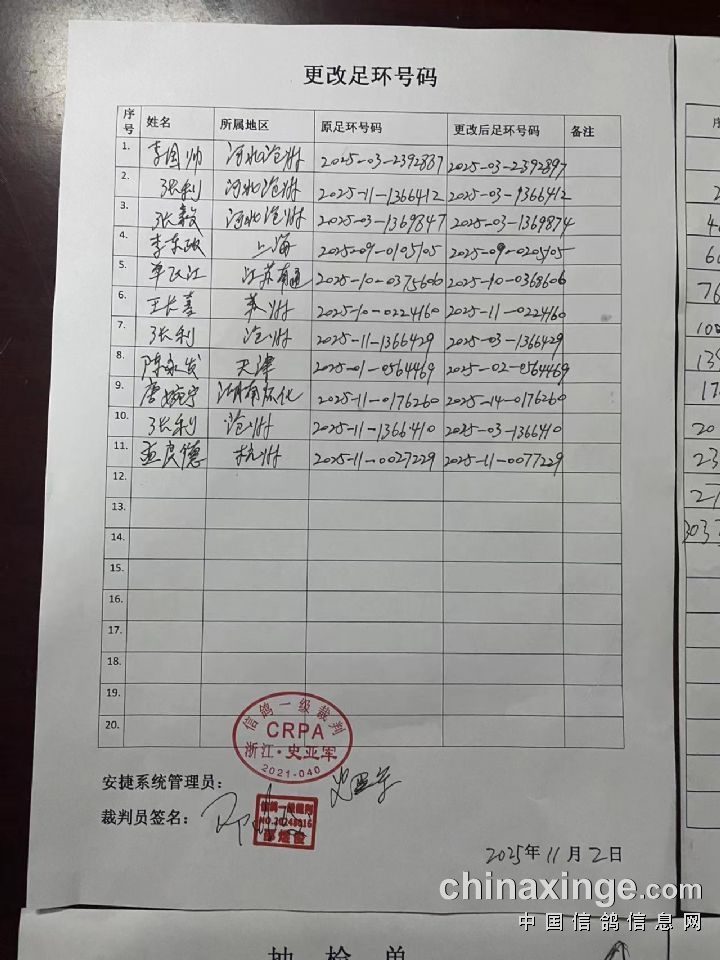 浙江德飞赛鸽公棚100公里收费站更改足环号码明细
