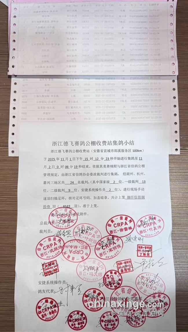 浙江德飞赛鸽公棚100公里收费站三日归巢清单(按名次排序)