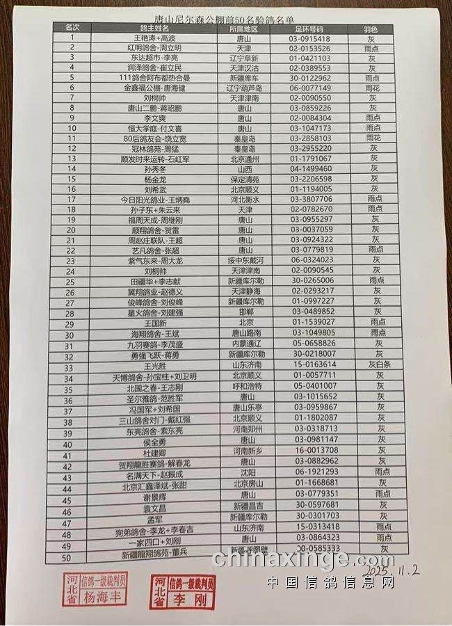 唐山尼尔森公棚300公里第一关前五十名验鸽名单