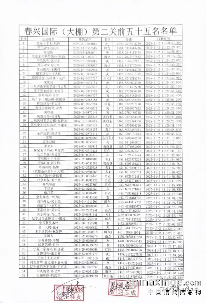 春兴国际(大棚)第二关比赛前55名获奖鸽名单