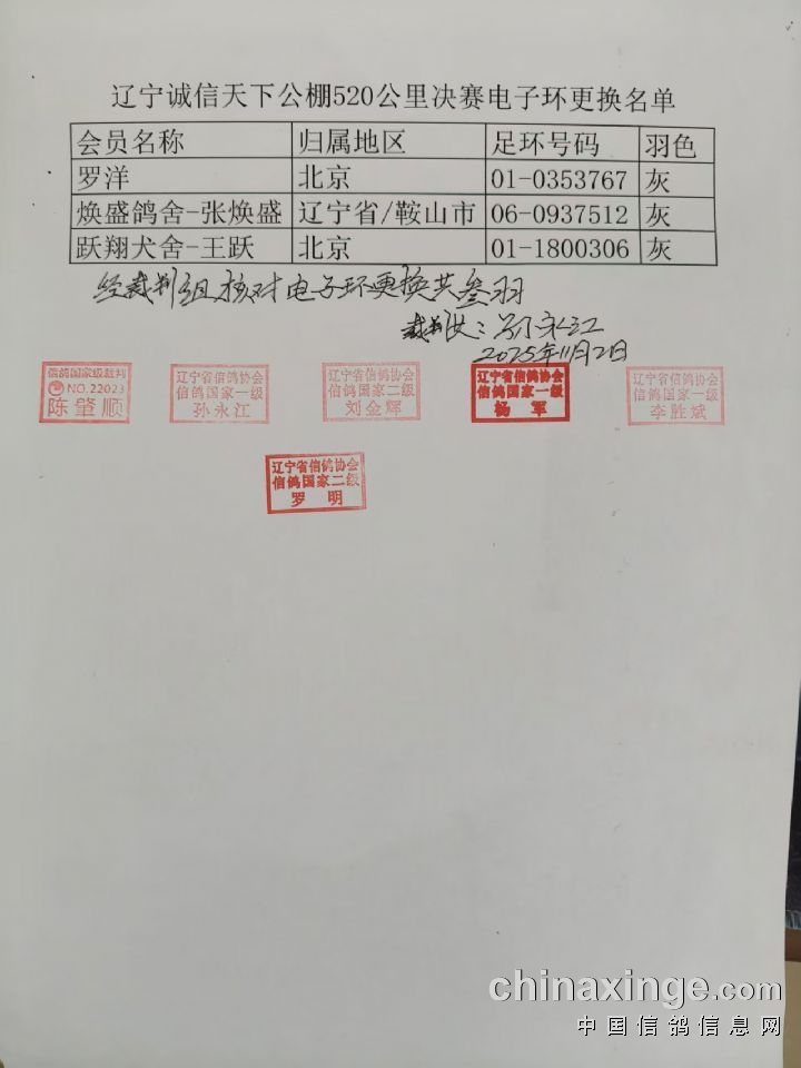 辽宁诚信天下公棚520公里决赛彩鸽获奖名单