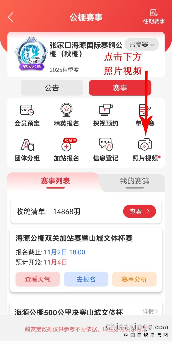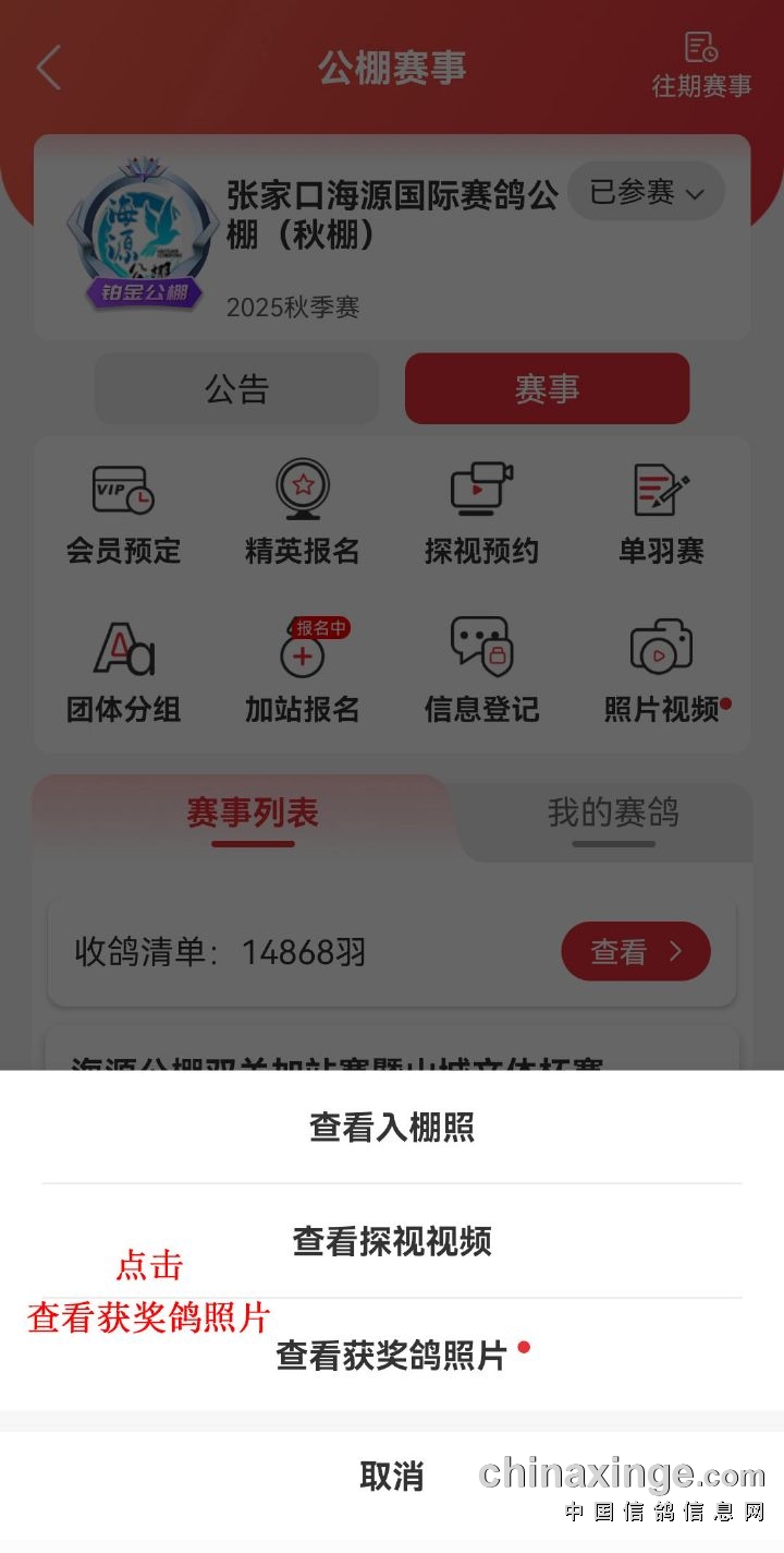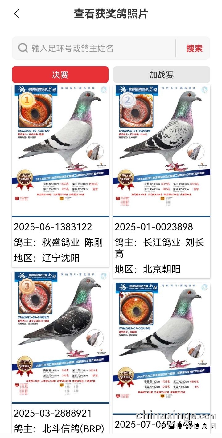 海源公棚2025年第二届秋季赛事获奖鸽照片已拍摄完毕,因中信网屏蔽,请登录D鸽P友S宝,查看获奖鸽照片,输入环号或参赛名称即可查看获奖鸽照片;或从我棚办公微信朋友圈识别二维码,查看获奖鸽照片。