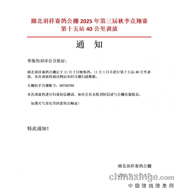 湖北羽祥公棚第十五站训放取消通知