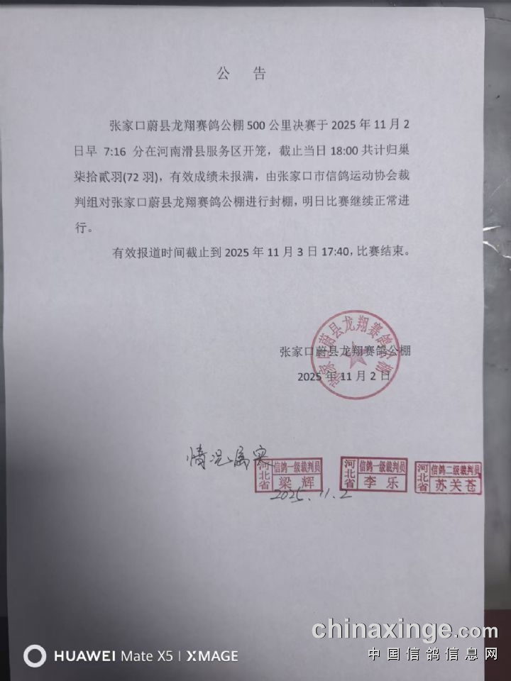 龙翔赛鸽公棚500公里决赛388名成绩有效证明