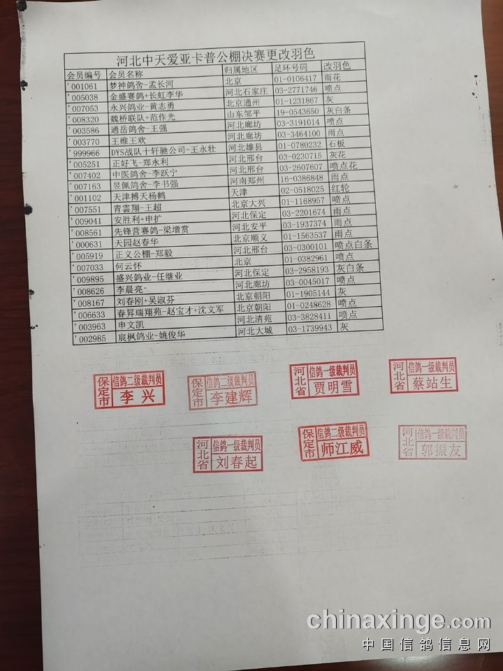河北中天爱亚卡普公棚决赛鸽王获奖名单