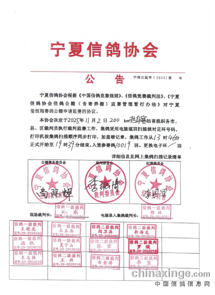 宁夏玺恒翔公棚200公里热身赛奖金领取通知