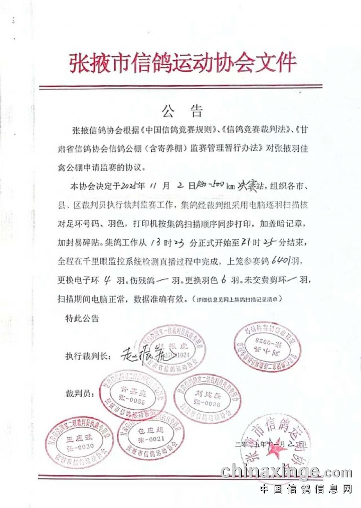 甘肃羽佳禽赛鸽公棚495公里决赛归巢扫描公告