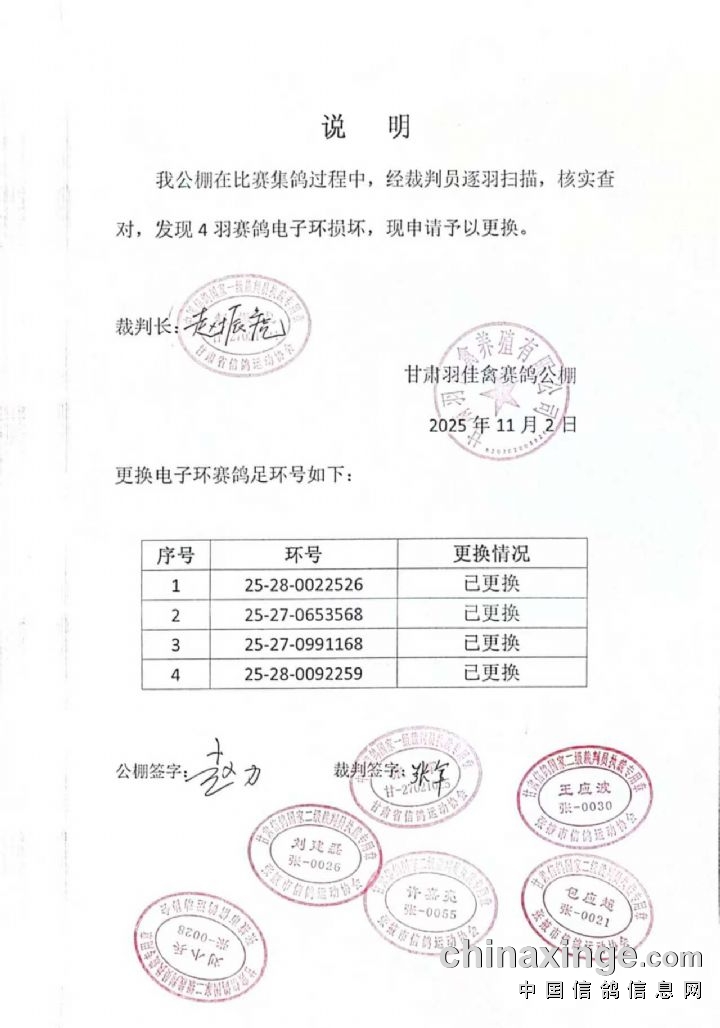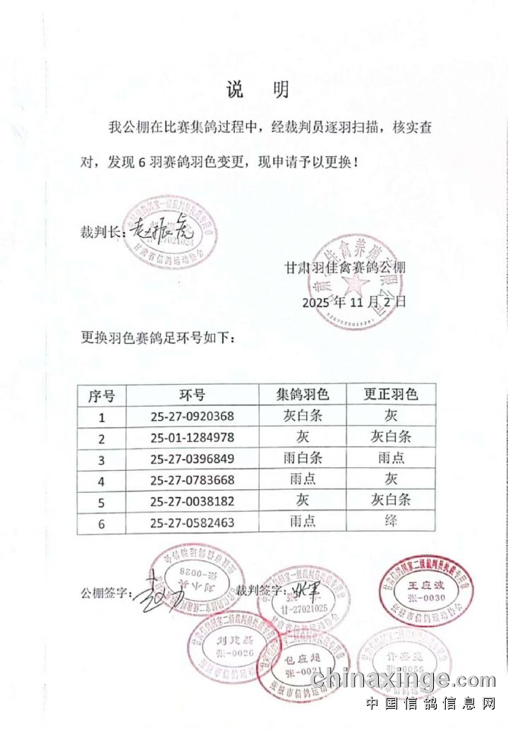 甘肃羽佳禽赛鸽公棚480-500公里决赛集鸽清单、更换电子环、羽色更正名单