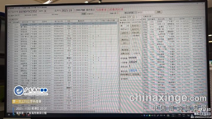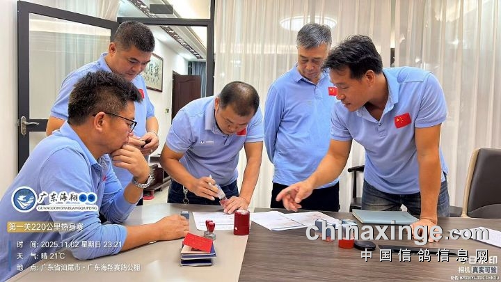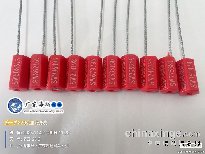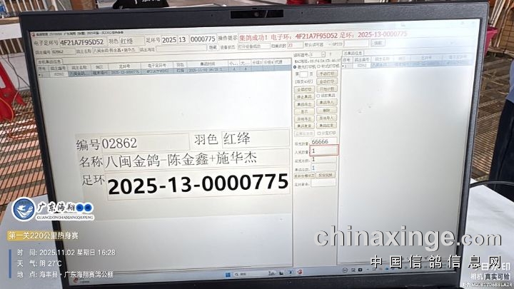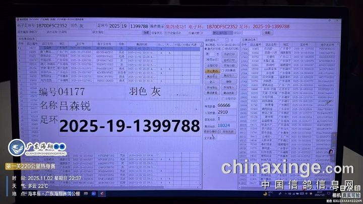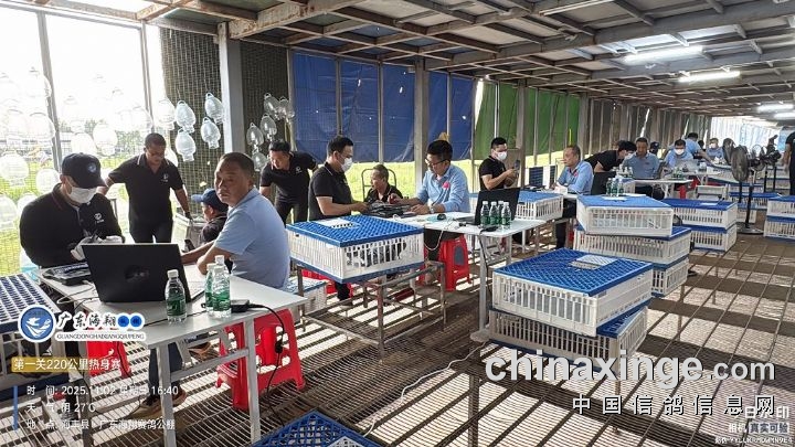 2025年广东海翔(秋棚)第九届第一关230公里热身赛,由广东省鸽协委派裁判长及汕尾市裁判组进行逐羽扫描、核对环号、盖章等工作;共集鸽18024羽。