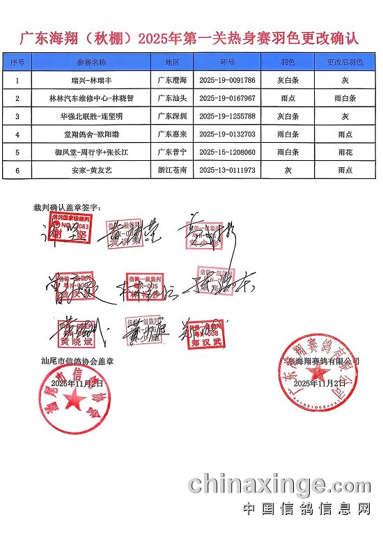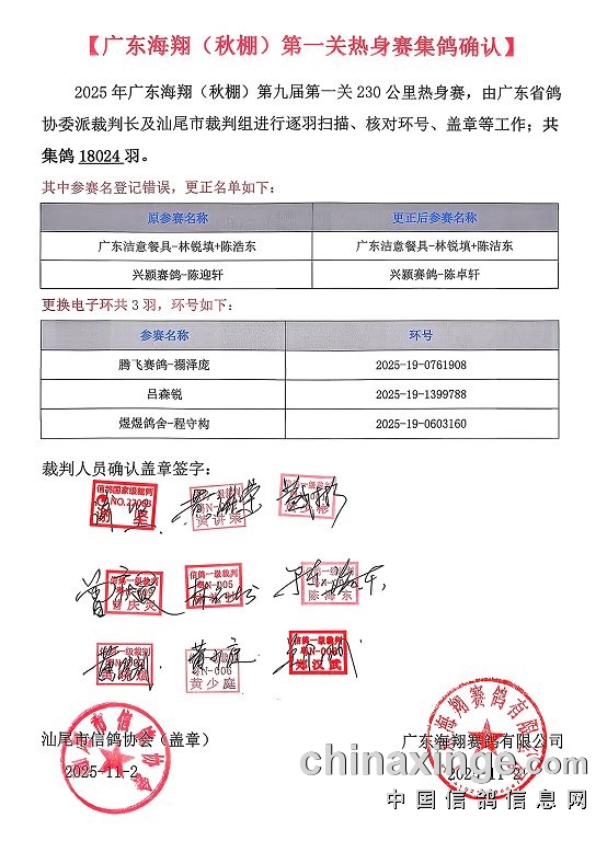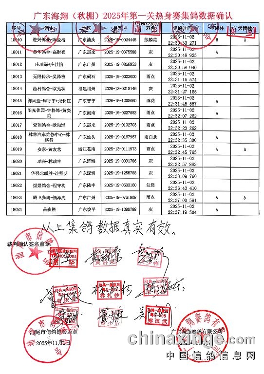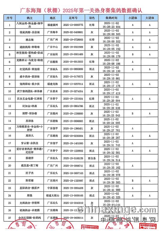 | 【广东海翔(秋棚)第一关热身赛集鸽确认】
