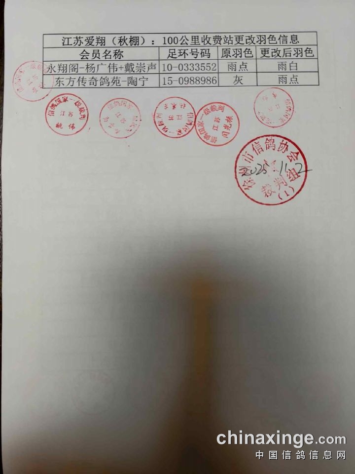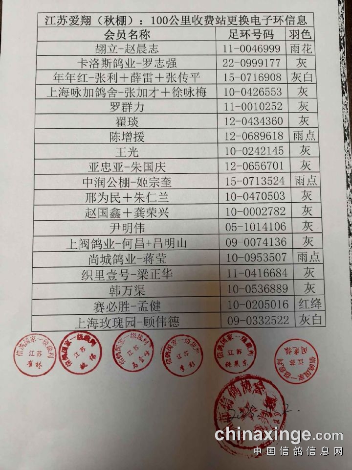 江苏爱翔(秋棚):100公里收费站更换电子环及更改羽色名单