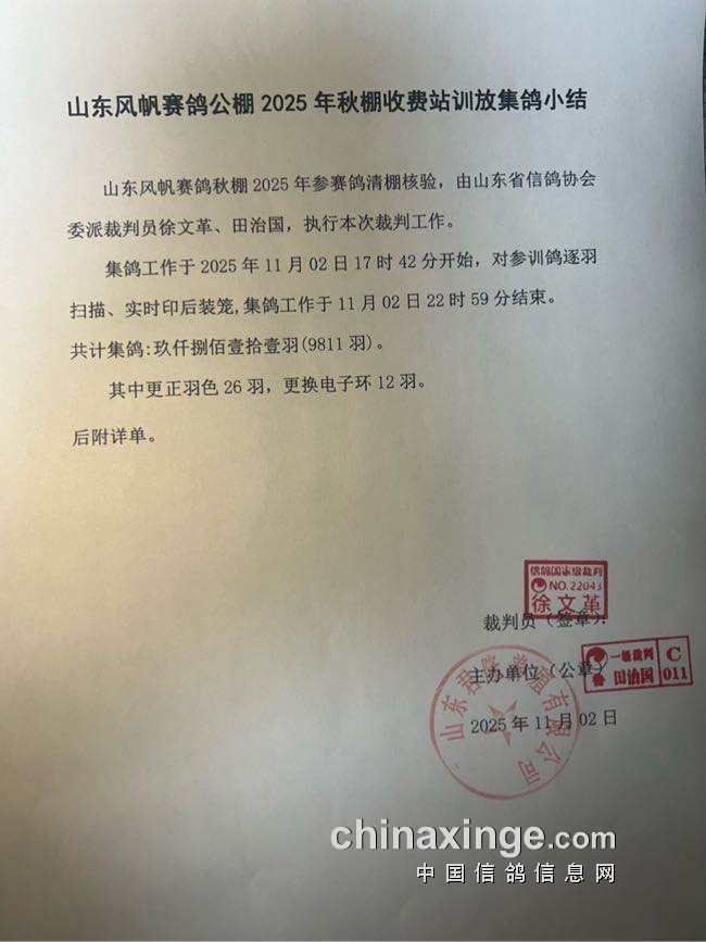 山东风帆赛鸽公棚(秋棚)100公里收费站开笼公告及数据直播