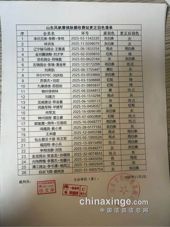 山东风帆赛鸽公棚(秋棚)100公里收费站更改羽色名单