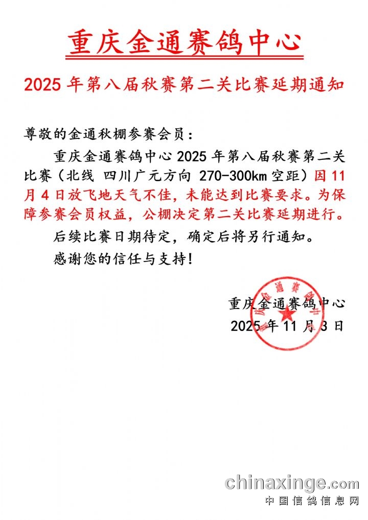 重庆金通2025年秋赛第一关开笼通知