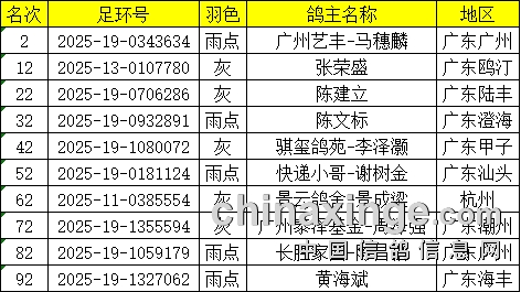 根据2025年竞赛章程热身赛时需邀请前一站排名第2名12名22名32名42名52名62名72名82名92名的十位鸽主参加监督入笼及随车放飞全过程,以下为监放鸽友的名单: