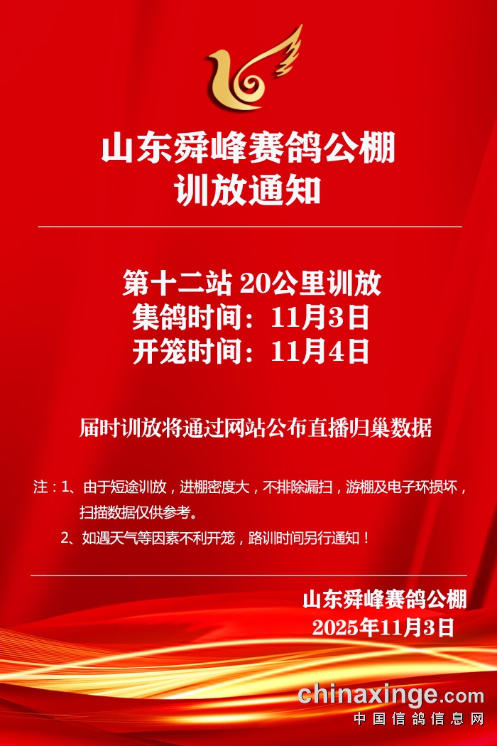 山东舜峰赛鸽公棚第十二站20公里训放通知