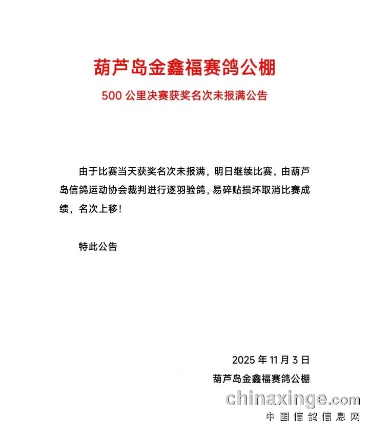 葫芦岛金鑫福赛鸽公棚500公里决赛获奖名次未报满公告