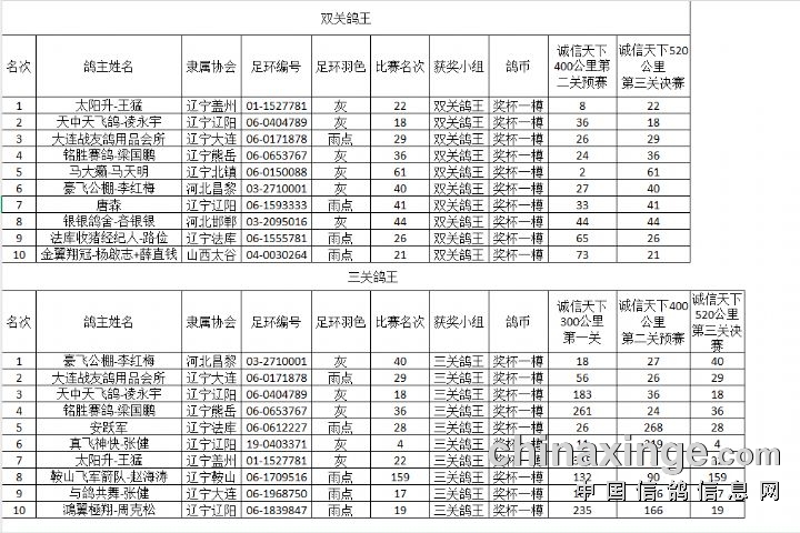 辽宁诚信天下公棚520公里第三关决赛双关鸽王三关鸽王获奖名单