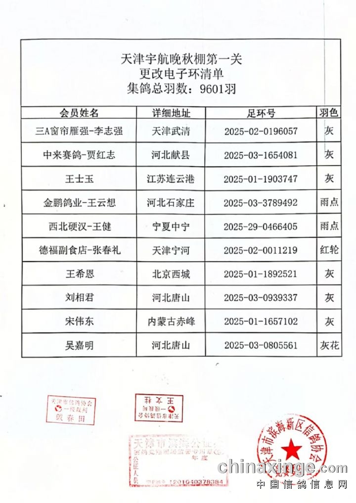 天津宇航晚秋棚200公里第一关各项成绩名单