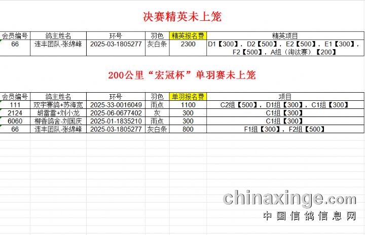 决赛精英、200公里“宏冠杯”单羽赛已报名未上笼退费清单