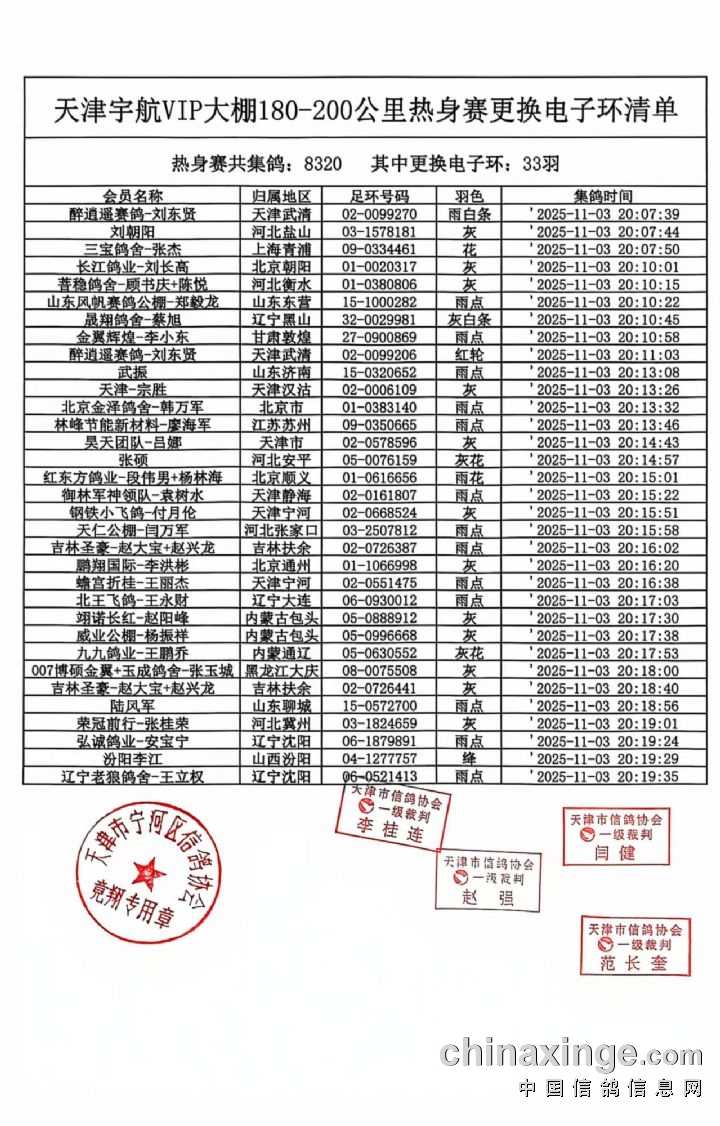 天津宇航VIP大棚180公里热身赛当日归巢数据