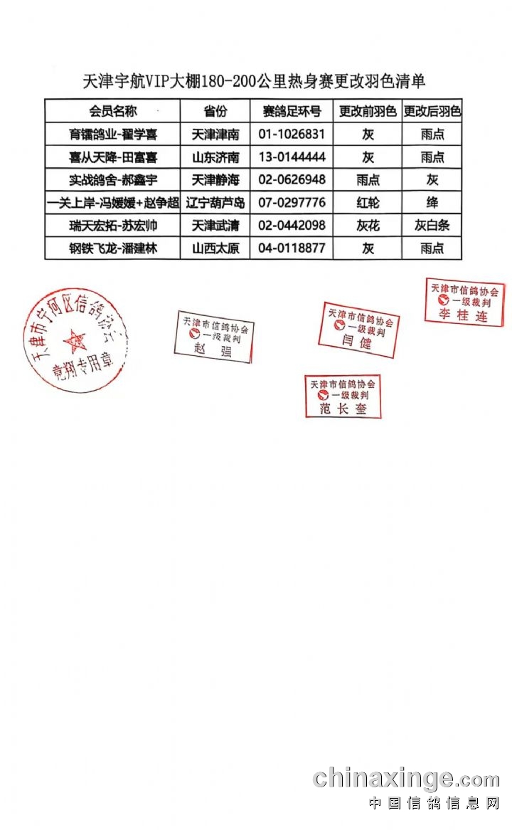 天津宇航VIP大棚180-200公里热身赛更改羽色