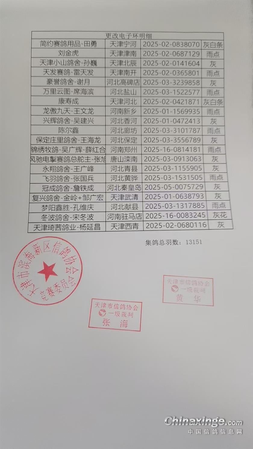 天津市丽翔国际赛鸽公棚更改电子环明细