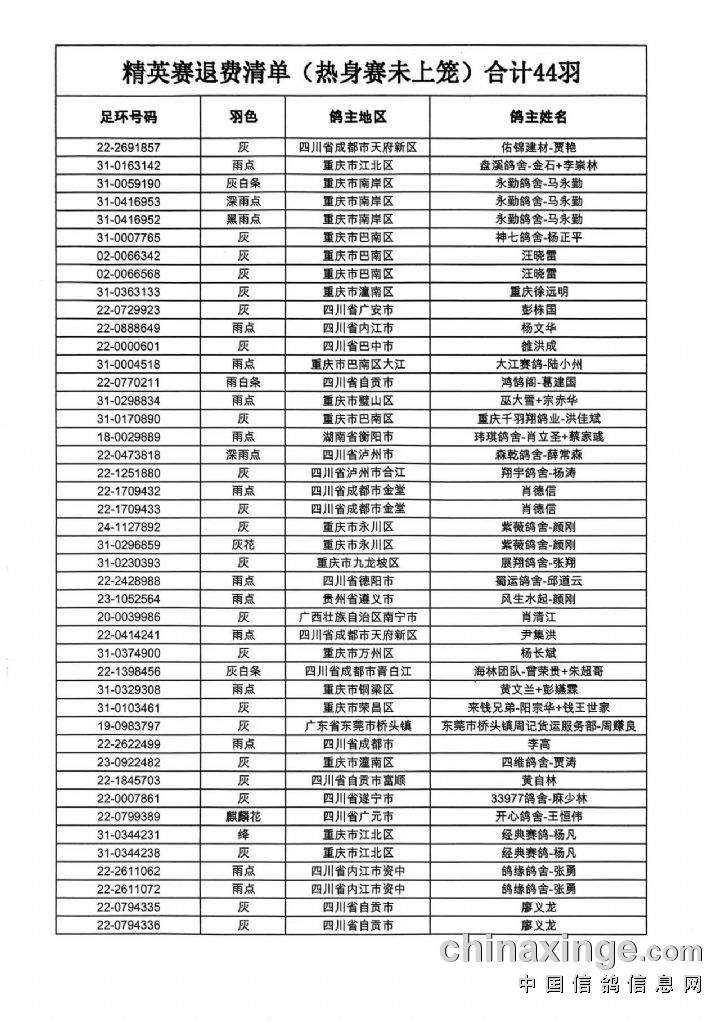 根据《重庆翔标公棚2025年秋赛首届竞赛章程》,第一关热身赛逐羽扫描后,将对未上笼精英赛报名鸽进行退费,以下为精英赛未上笼鸽清单(查阅后请未上笼鸽鸽主联系工作人员退费 19196395927):