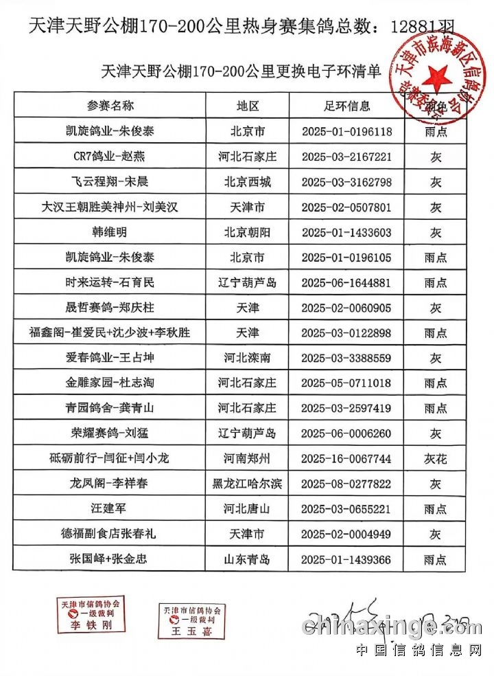 天津天野公棚热身赛170-200公里手扫集鸽上笼数据