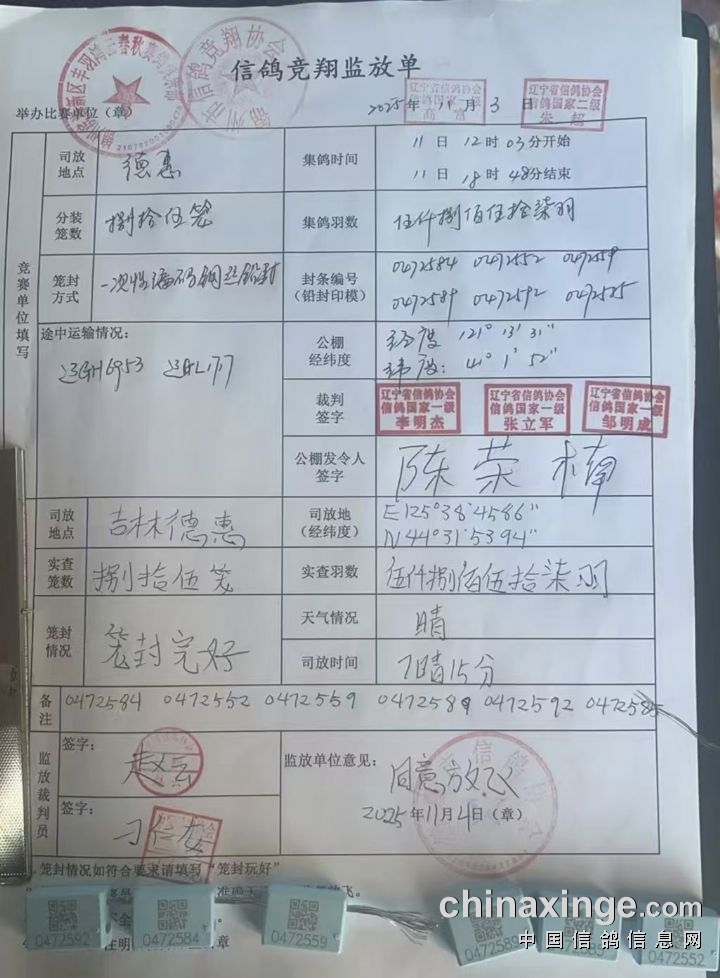 2025年辽宁丰羽公棚530公里决赛集鸽数据(按顺序)