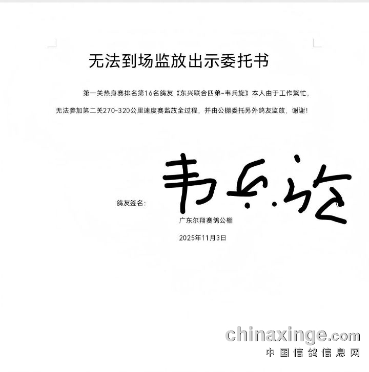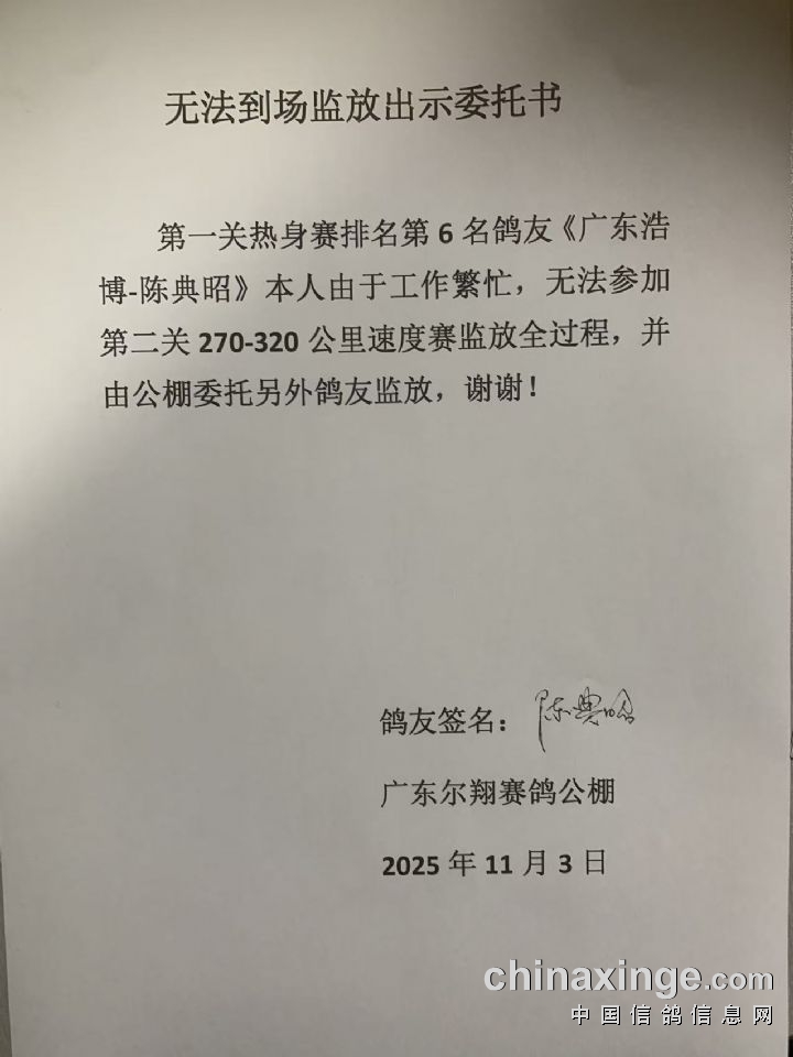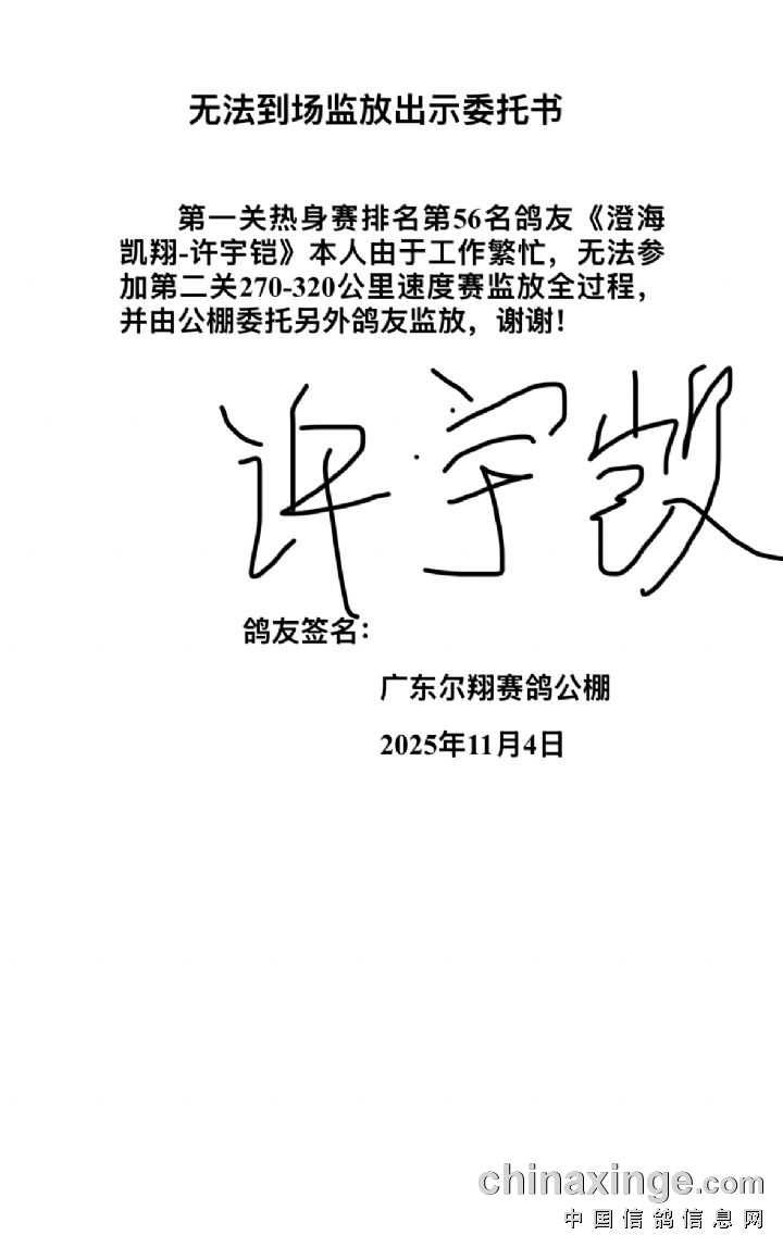广东尔翔(秋棚)2025年第四届第二关270-320公里速度赛定于11月6日开始集鸽,11月7日早上开笼。速度赛司放地点:福建漳州漳浦,空距约:294公里;届时由广东省鸽协委派裁判长及汕尾市裁判组进行逐羽扫描、核对环号、盖章、监放等工作!