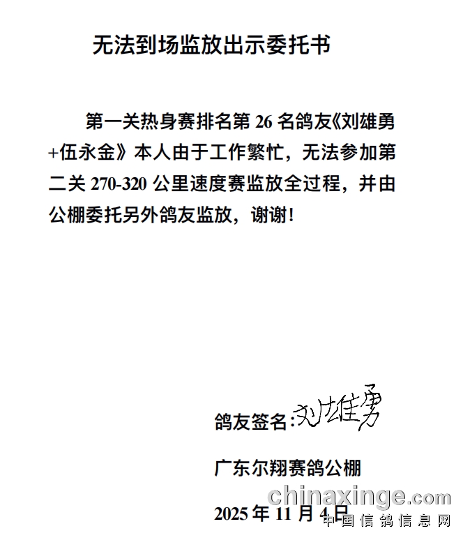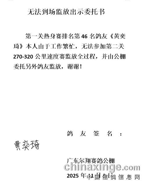 第6、16、26、46名、56名的鸽友由于个人原因无法参与本次速度赛的监放!