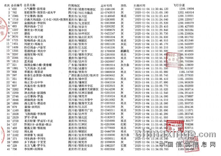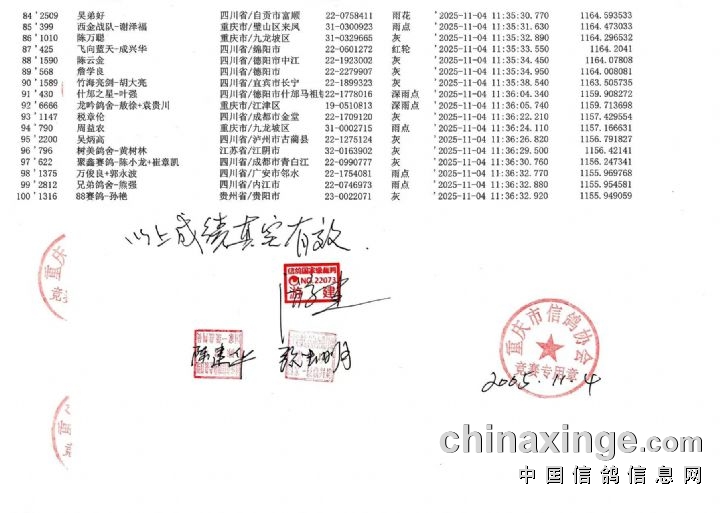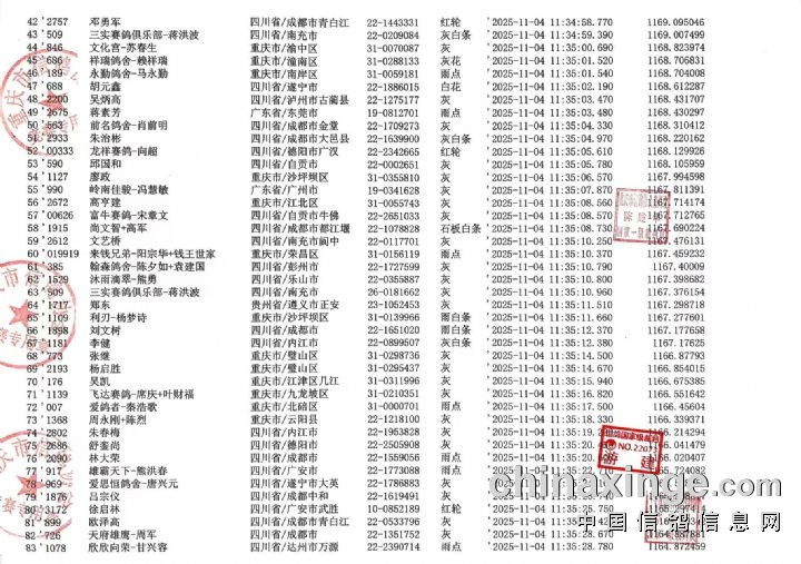 重庆翔标公棚2025年秋赛热身赛前一百名清单如下: