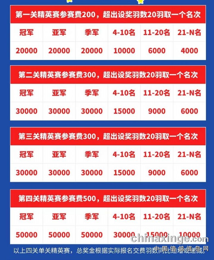 主规程6500羽重磅设奖:冠军20万元、亚军15万元、季军10万元;4-10名各2万元,11-1000名各1万元,头部大奖震撼普惠奖项覆盖广!