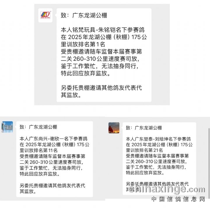 第1名11名21名的鸽友由于个人原因无法参与本次热身赛的监放!