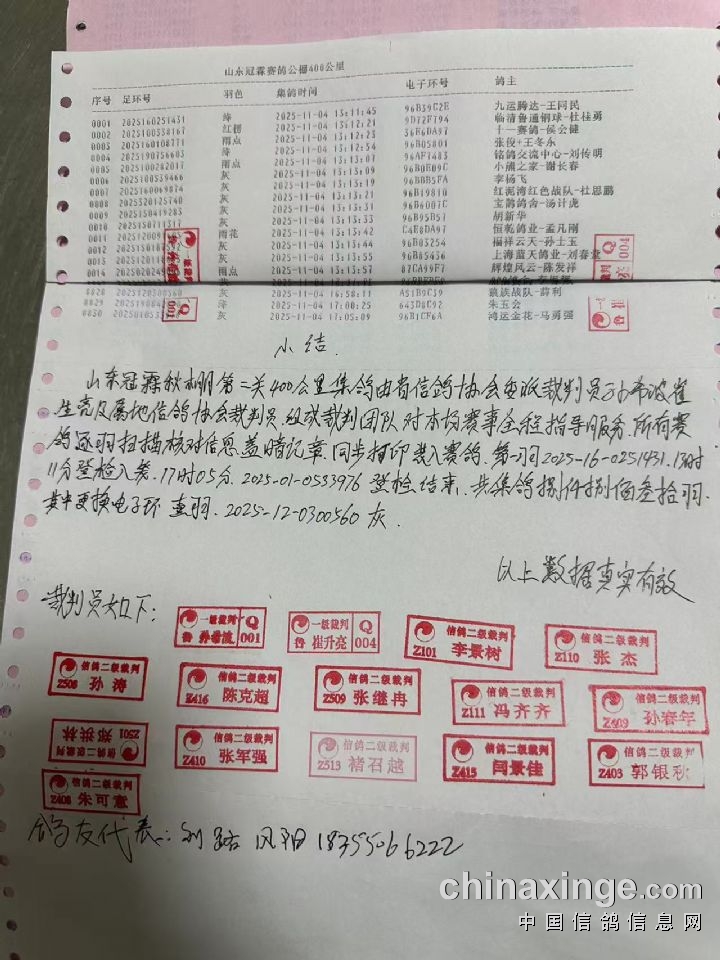 山东冠霖赛鸽公棚400公里更换电子环清单
